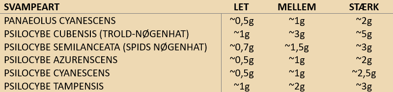 Som nævnt findes der mange forskellige psilocybinholdige svampe arter, og de indeholder hver især forskellige koncentrationer af de aktive stoffer. Doseringen afhænger derfor af den valgte svamp. Det bør også bemærkes, at to svampe af samme art kan variere en lille smule i potens, men generelt kan man gå ud fra en gennemsnitlig dosering, som angivet herunder.